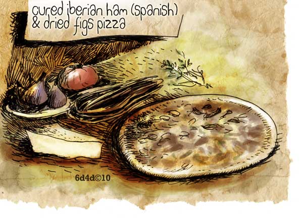 Put mozzarella cheese all over the pizza (you can add fresh chopped tomatoes too). Then, the ham (cut into strips) and figs (sliced into quarters) and a splash of virgin olive oil (does not need salt because the ham has enough). Bake and serve. Delicious.