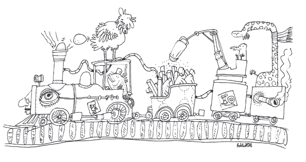 Otro de esos dibujos improvisados que hago a mis hijos cuando quiero que se queden tranquilos mientras esperan la cena. En este caso, un tren un poco loco, con ojos en la locomotora, una gallina que tapona con sus huevos la chimenea, un pez maquinista, patatas fritas en lugar de carbón para alimentar la caldera que se encarga de llevar con una grua un topo ciego y una jirafa resfriada que se disloca el cuello para ver toda esta chifladura. ¡Ah! Y los travesaños de las vías son barras de pan.