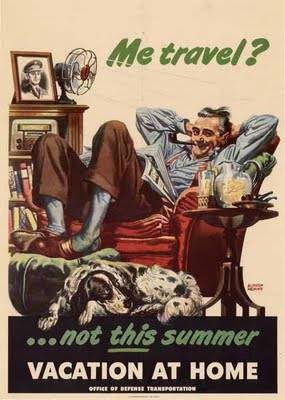 Como el tipo de la ilustración, este agosto (ya va casi la mitad del mes) me quedo de vacaciones en casa. Al menos, mis razones son muy diferentes. Este cartel fue realizado por Albert Dorne para la Oficina de Transporte Militar durante la II Guerra Mundial, pretendiendo que todos los ciudadanos norteamericanos ahorren gasolina, dejándola para el uso militar, y no viajen, sobre todo a Europa, claro.