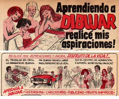 An old illustrated advertisement about the rewarding of the cartoonist or illustrator work. By all accounts it, if you make this cartoonist course, you’ll go to a profession where the pay is good, you’ll have much free time and becomes one in the spotlight and do hundreds of friends (mostly female)… Too bad not having dedicated to this at the time of this advertisement!