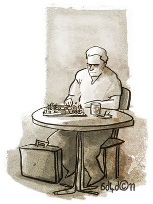 Hace poco vi a un hombre, jugando al ajedrez, a la puerta de un bar del barrio que está justo al lado del mercado, con una maleta bajo la mesa? Debía ser ruso o algo así, supuse consciente de nuestra propia identidad nacional, tan difusa como es.