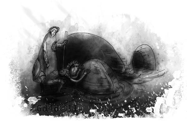 …Así que el bote arribó a la orilla del poblado de las cloacas y dos viejos cazadores se acercaron, atraídos por el eco del agua y el crujido de las tablas.