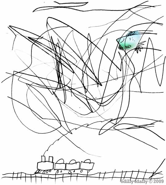 Here, I drew a train and Darius the dense smoke, which hid a fish.